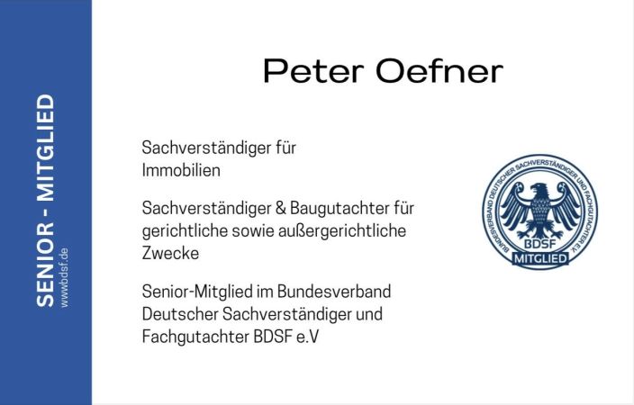 „Als Senior-Mitglied im Bundesverband Deutscher Sachverständiger und Fachgutachter e.V. (BDSF) verfügt Peter Oefner über nachgewiesene Fachkompetenz und langjährige Erfahrung in der Immobilienbewertung und Gutachtenerstellung. Die Mitgliedschaft im BDSF unterstreicht seine Qualifikation für gerichtliche und außergerichtliche Gutachten auf höchstem fachlichen Niveau.“