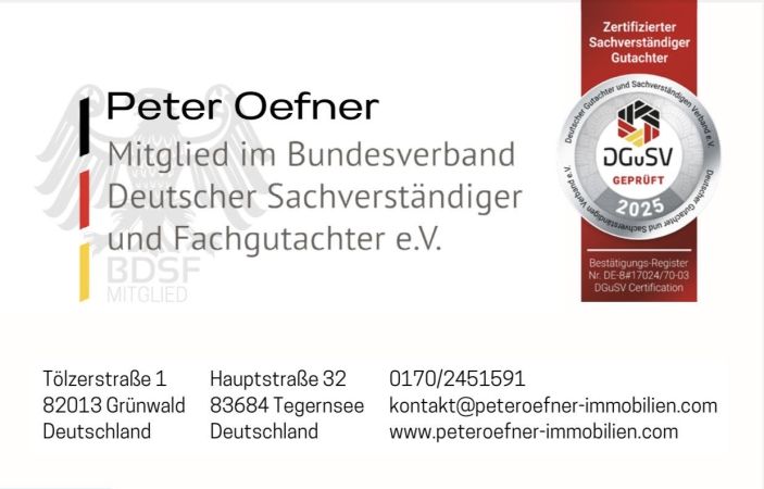 „Peter Oefner ist geprüfter und zertifizierter Sachverständiger nach den Standards des Deutschen Gutachter und Sachverständigen Verbands e.V. (DGuSV). Die Auszeichnung bestätigt seine Qualifikation als Gutachter und seine Anerkennung im offiziellen DGuSV-Bestätigungsregister – ein Qualitätssiegel für fachlich fundierte, objektive und unabhängige Gutachten.“